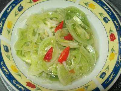 tomato hijau, bawang besar setengah biji, cili merah / cili padi, cuka, gula dan garam